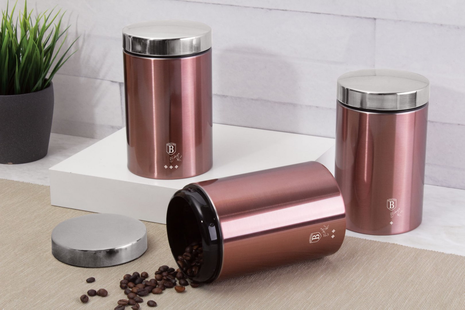 Blask różowego złota w Twoim domu. Zestaw pojemników Berlinger Haus z serii I-Rose to propozycja dla miłośników stylu glamour. Trzy pojemniki wykonane ze stali nierdzewnej pokryto efektownym, metalicznym lakierem w odcieniu różu.