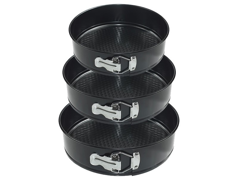 Zestaw 3 tortownic (24/26/28 cm) ze stali węglowej. Powłoka non-stick, otwierany bok.