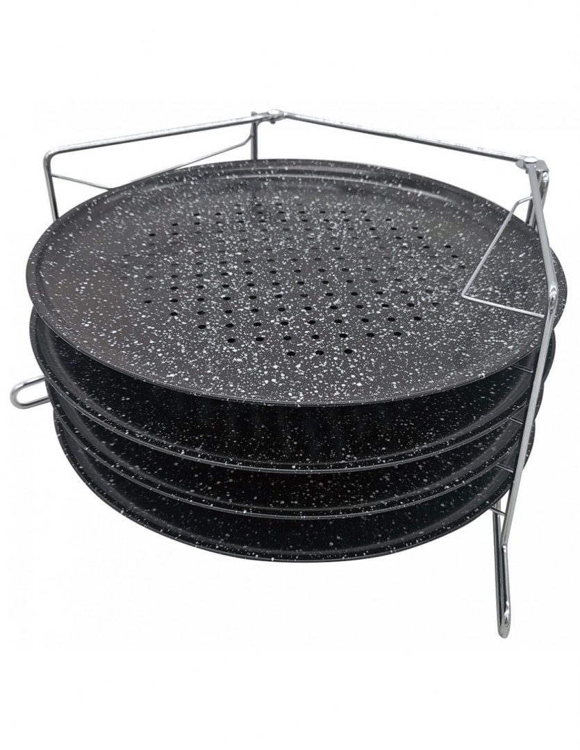 Zestaw 4 blach do pizzy ze stojakiem do piekarnika. Powłoka non-stick, otwory wentylacyjne. Piecz 3 pizze naraz!