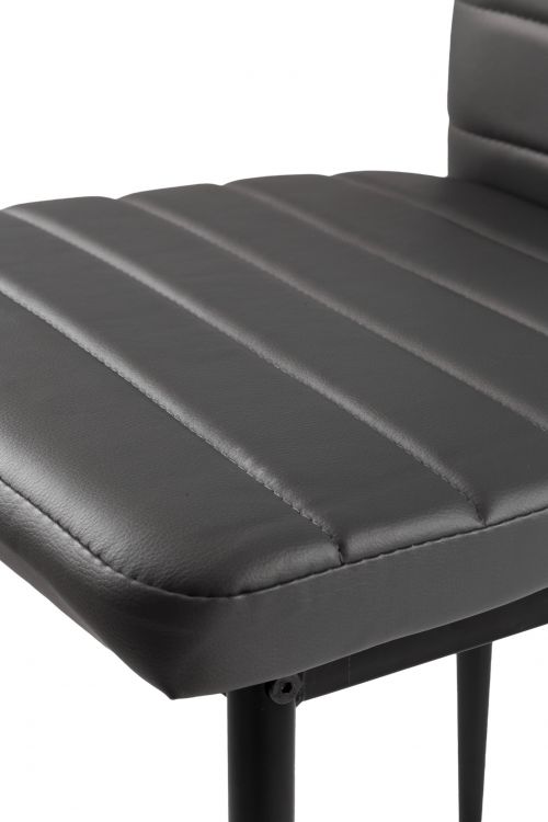 Zestaw 4 krzeseł z szarej ekoskóry na czarnych nogach. Wyprofilowane oparcie, miękka pianka PU i stabilna stalowa konstrukcja. Udźwig 120 kg. Uniwersalny styl LOFT od ModernHome.