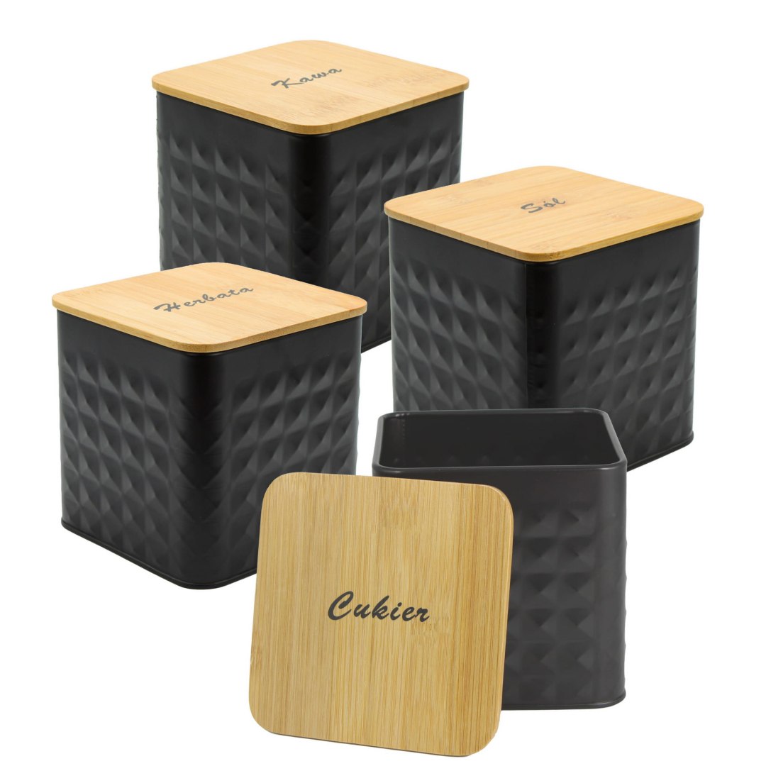 Zestaw 4 czarnych pojemników z polskimi napisami (Kawa, Herbata, Cukier, Sól). Bambusowe wieczka z uszczelką.