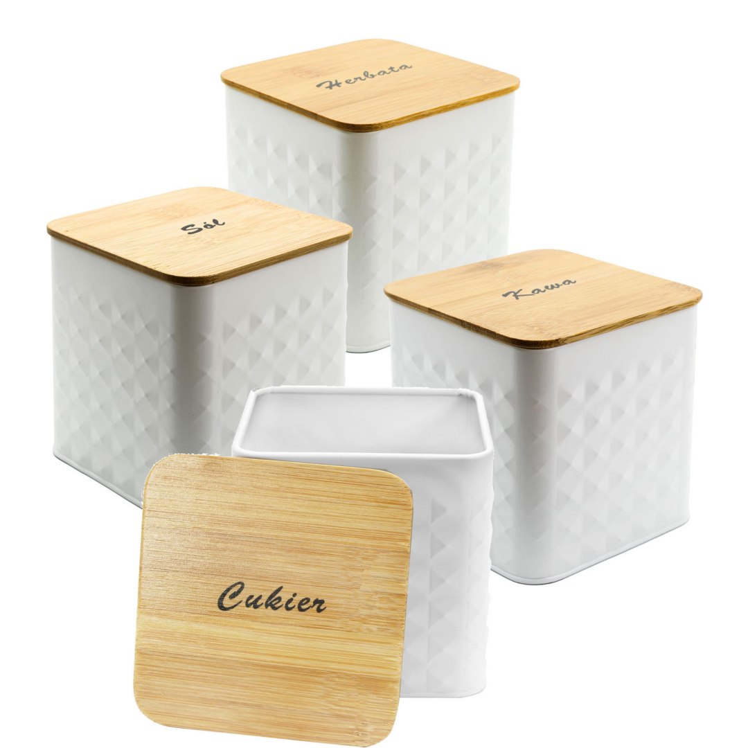 Zestaw 4 białych pojemników stalowych z bambusem. Polskie napisy: Kawa, Herbata, Cukier, Sól. Szczelne zamknięcie.