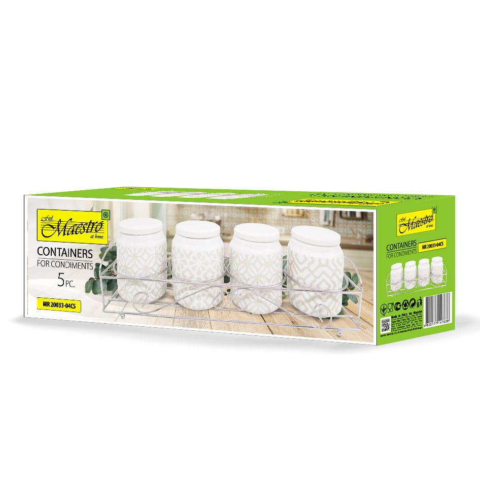 Elegancja w każdym detalu. Zestaw Maestro MR-20033-04CS składa się z czterech pojemników na przyprawy wykonanych z wysokiej klasy ceramiki. Całość umieszczona jest na praktycznym metalowym stojaku, który ułatwia organizację przestrzeni.