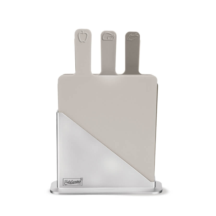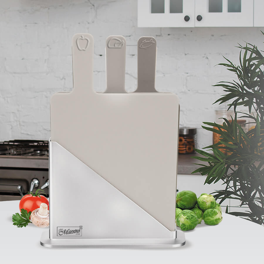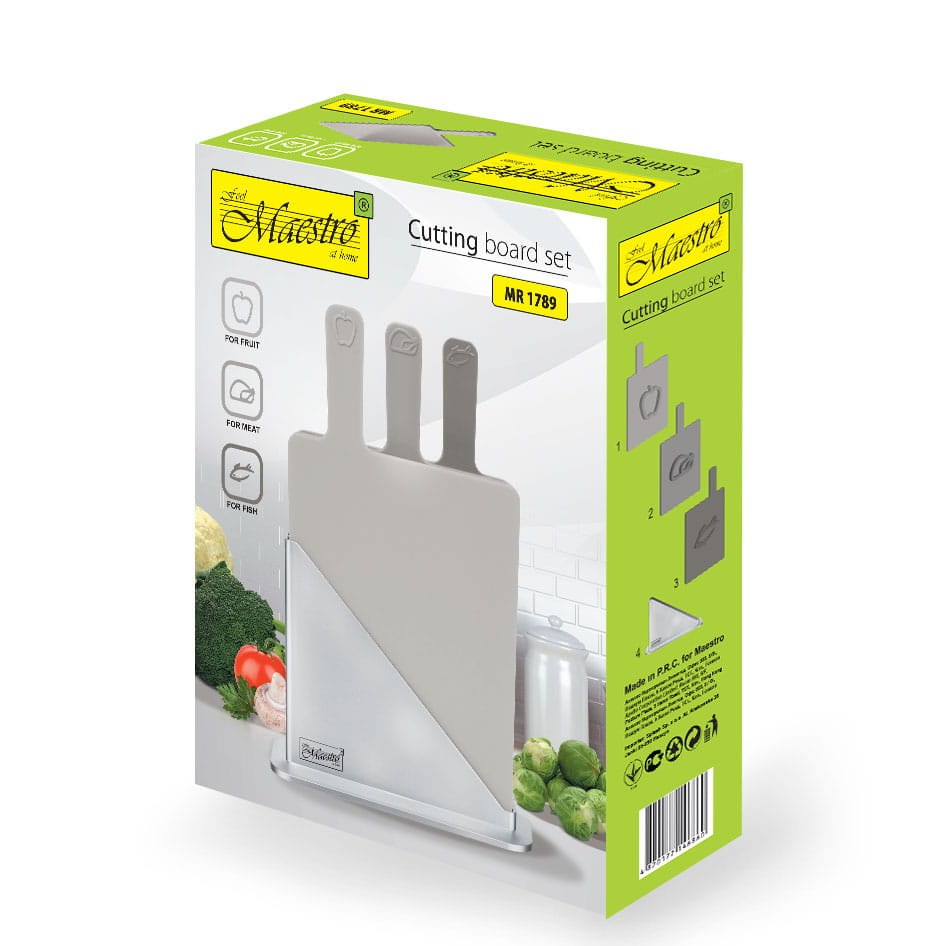 Kompaktowy i higieniczny zestaw. Maestro MR-1789 zawiera trzy dwustronne deski do krojenia oraz praktyczny stojak. Deski wykonane są z solidnego tworzywa sztucznego, które nie tępi noży i posiada powierzchnię antypoślizgową.