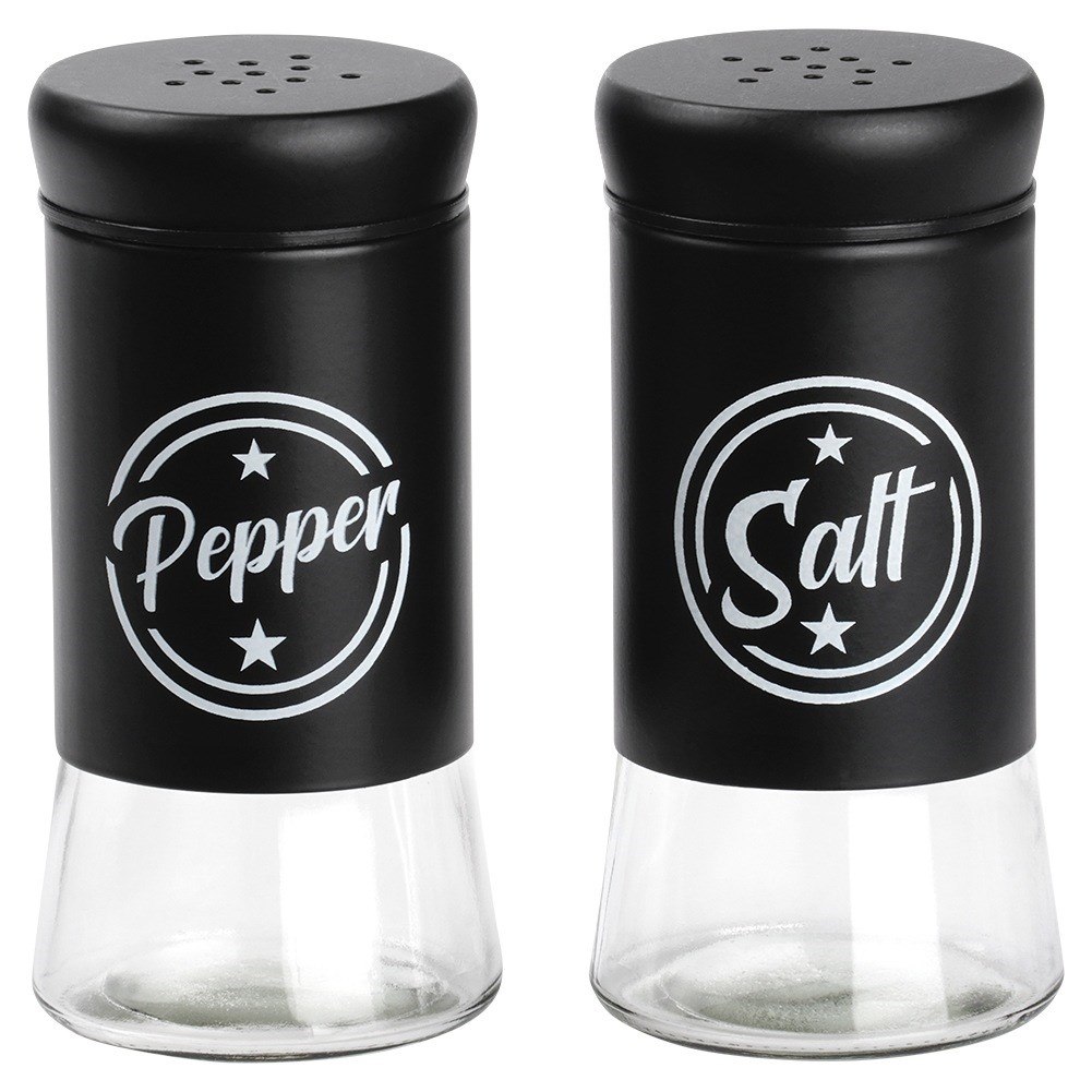 Zestaw 2 dużych pojemników na sól i pieprz (140ml). Szkło z czarnym wykończeniem. Nowoczesny wygląd.