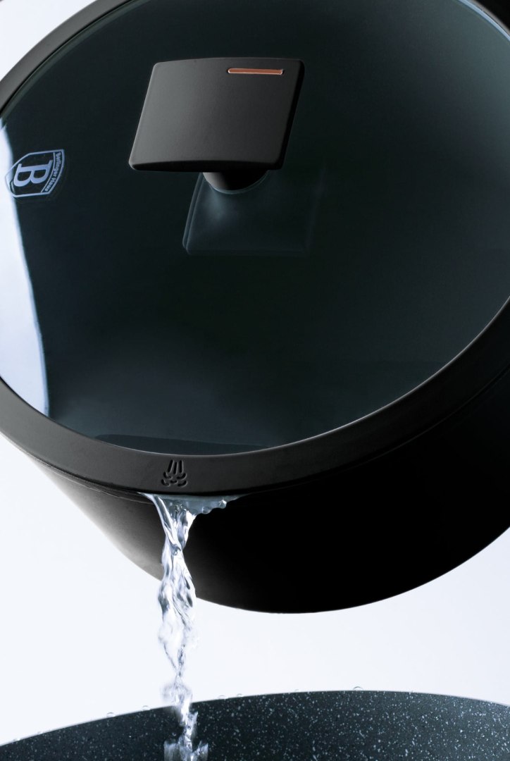 Potrójna powłoka tytanowa w kolorze szarym pozwala na beztłuszczowe smażenie bez ryzyka przywierania. Zestaw wyposażono w dwie pokrywki: szklaną z silikonowym rantem i wylewką oraz plastikową typu „Smart Lid” do przechowywania żywności. Uchwyty Soft Touch nie nagrzewają się.