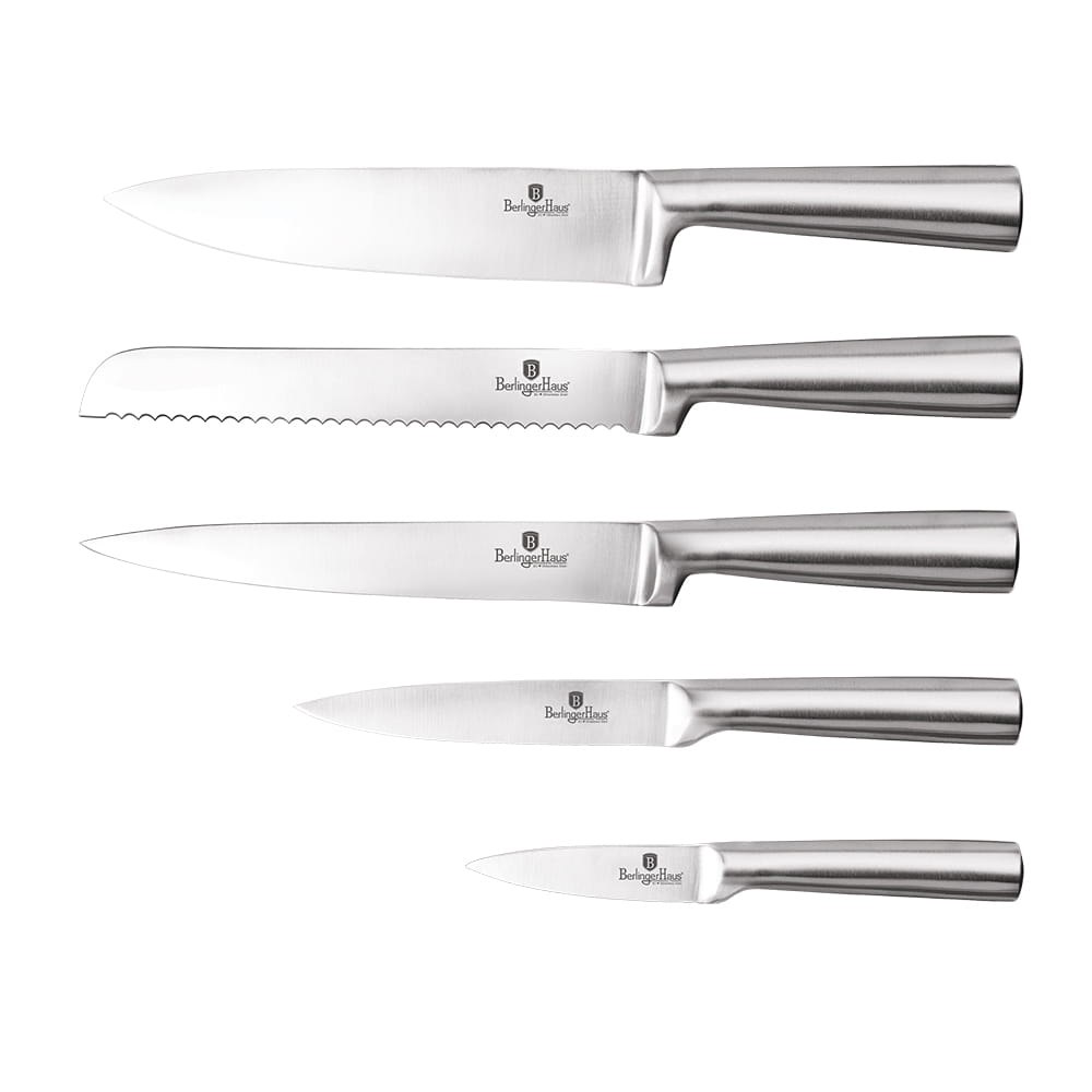 - Elementy: Nóż szefa, do chleba, 2 uniwersalne, do obierania, stojak.