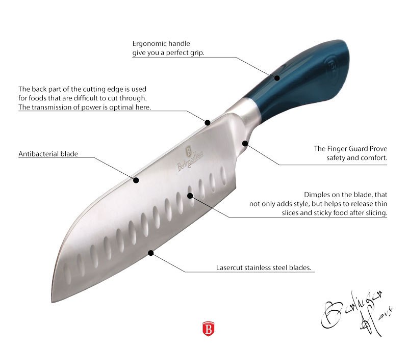 Kompletny zestaw Infinity. Berlinger Haus BH-2415 to 8-elementowy zestaw w pięknym kolorze akwamaryny. Noże wykonano z jednego kawałka stali nierdzewnej (Ferrinox 18/10), co gwarantuje ich niesamowitą trwałość i wyważenie. Brak łączeń to także większa higiena.