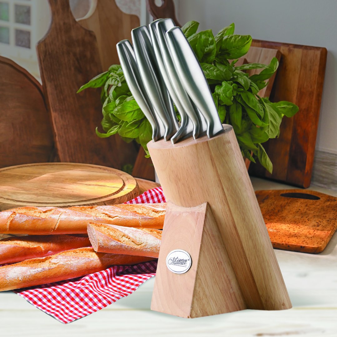 Zestaw zawiera: nóż szefa kuchni (20cm), do pieczywa, do trybowania, uniwersalny oraz do obierania. Solidne wykonanie i ostra stal nierdzewna gwarantują długie użytkowanie. Blok pomaga utrzymać porządek na blacie.
