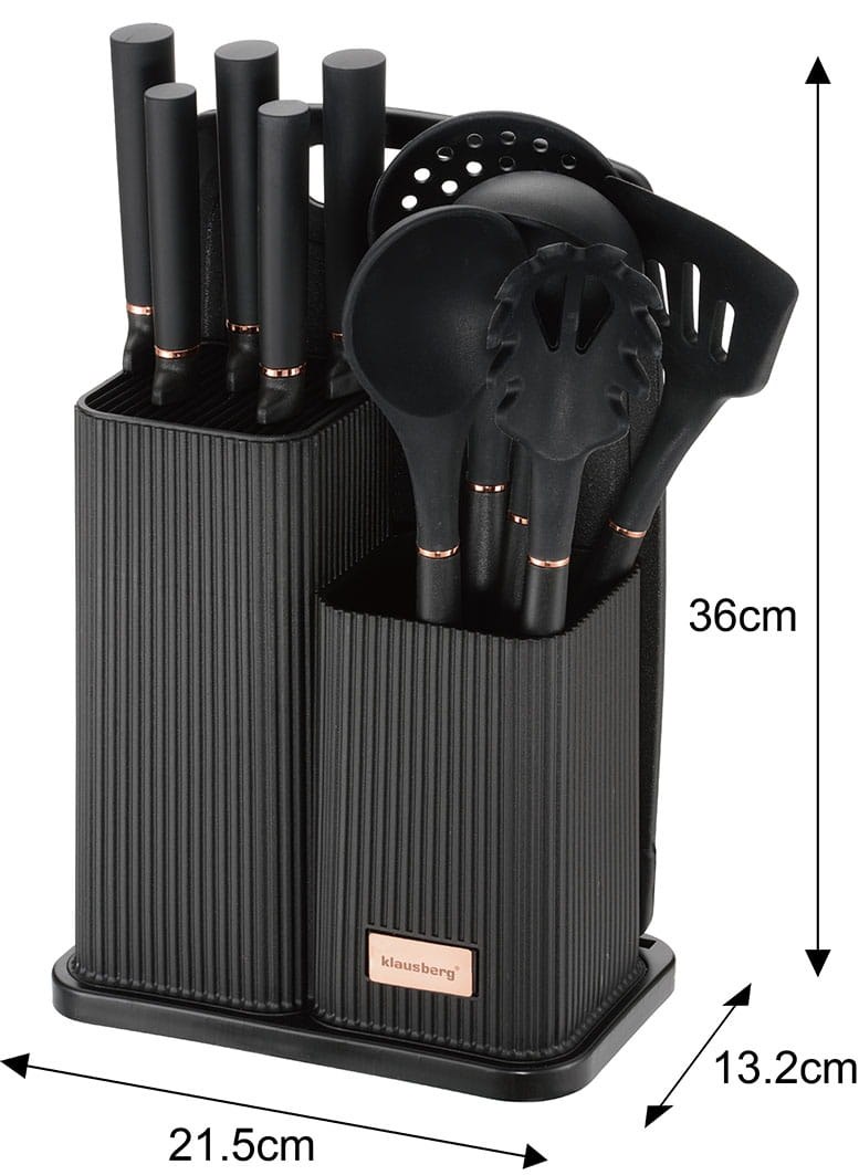 Wszystko, czego potrzebujesz w jednym miejscu. Zestaw Klausberg KB-7835 łączy w sobie 5 noży, komplet przyborów kuchennych oraz deskę do krojenia. Wszystkie te elementy mieszczą się w jednym, praktycznym bloku/stojaku, który pomaga utrzymać idealny porządek na blacie.