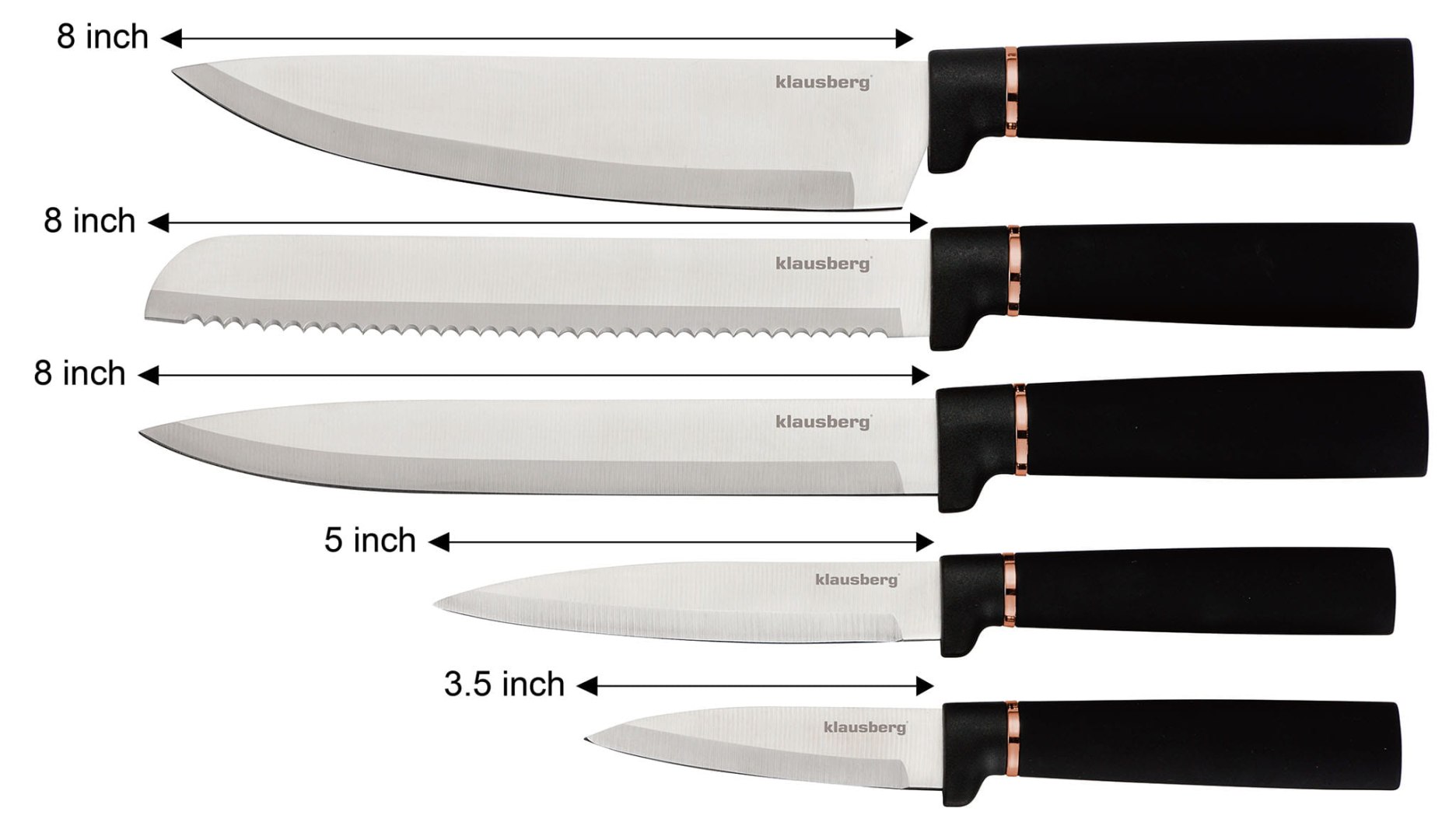 - Skład: 5 noży, 5 przyborów, deska, blok.