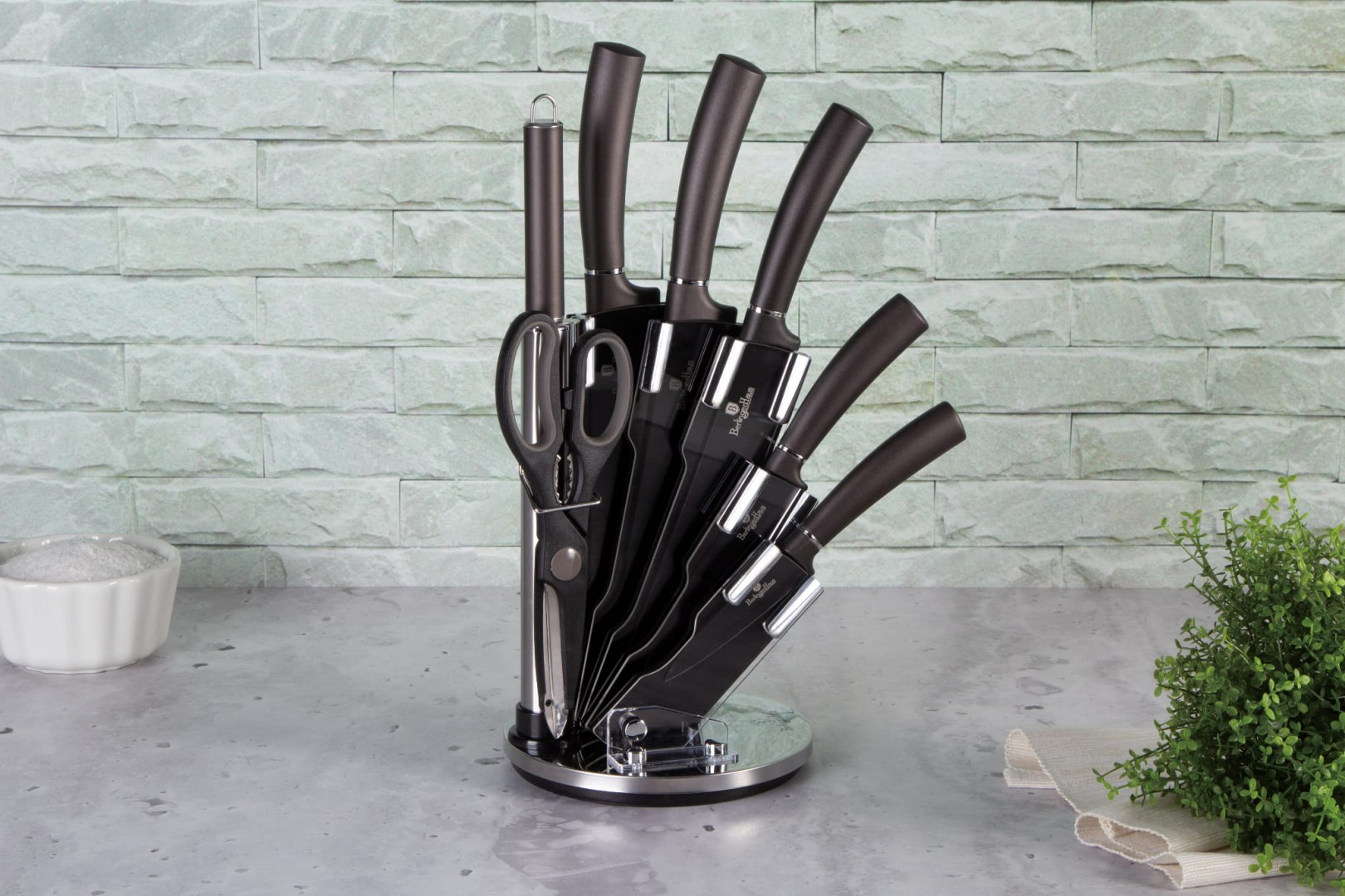 Profesjonalizm w kolorze grafitu. Zestaw Berlinger Haus Carbon Pro to 8 elementów, które łączą nowoczesny design z wysoką funkcjonalnością. Obrotowy stojak mieści 5 noży ze stali nierdzewnej, nożyczki oraz ostrzałkę, zapewniając porządek na blacie.