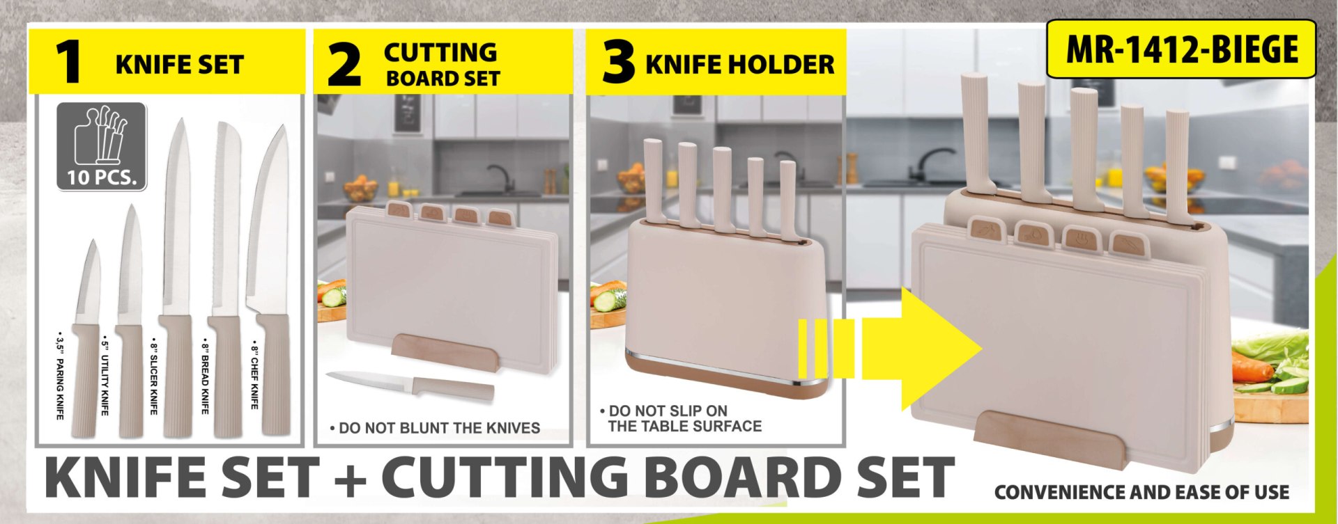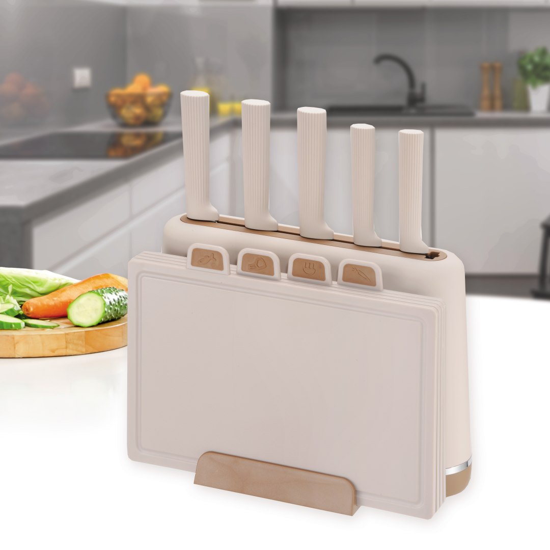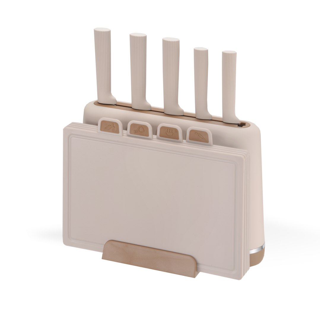 W zestawie: 5 noży (szefa kuchni, do pieczywa, do trybowania, uniwersalne, do obierania) oraz 4 deski do krojenia z indeksami (do różnych produktów). Beżowy kolor zestawu pasuje do jasnych kuchni. Solidne wykonanie gwarantuje długie użytkowanie.