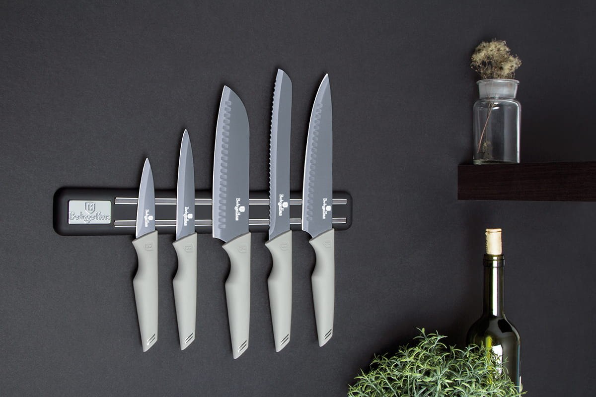 Zestaw 6 el.: 5 noży szarych i listwa magnetyczna. Seria Aspen. Powłoka non-stick.