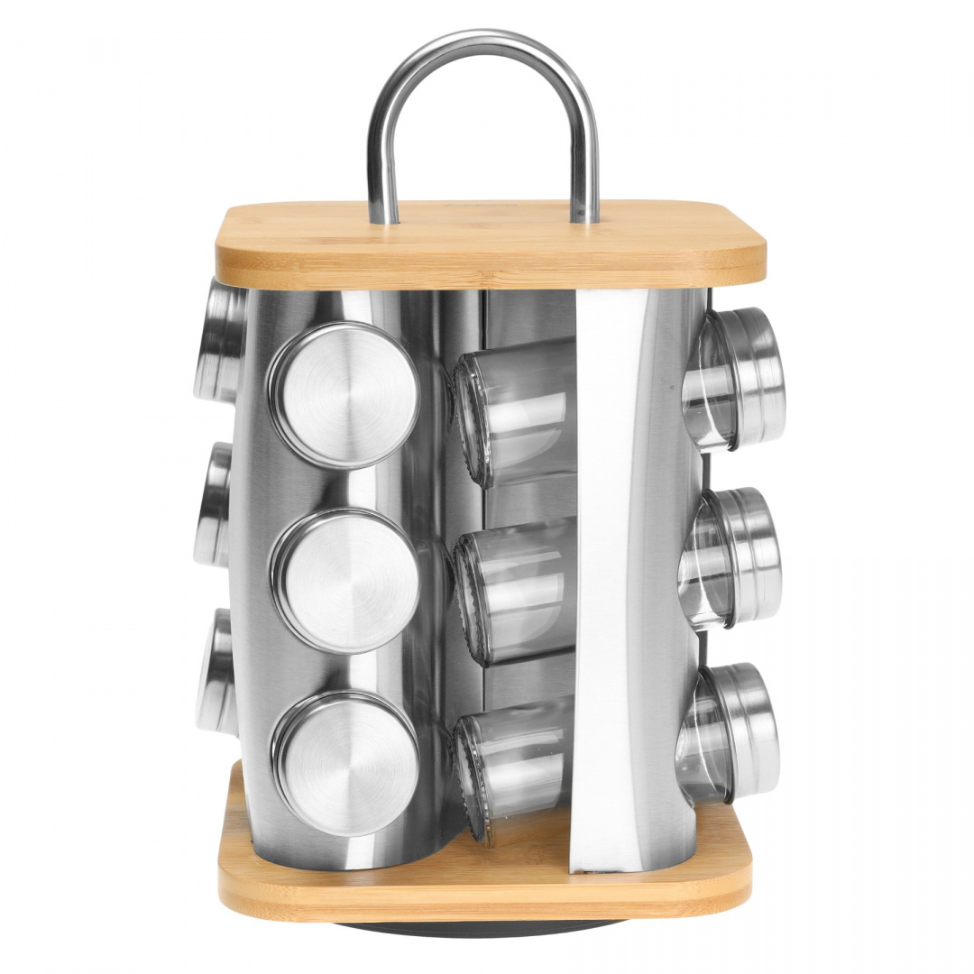 Zestaw 12 pojemników na przyprawy na obrotowym stojaku z bambusa i stali. Elegancki i praktyczny.