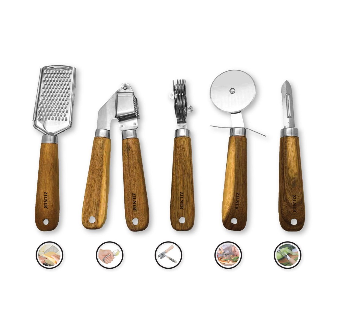 Funkcjonalność w drewnie i stali. Zestaw Zilner ZL-2143 to 5 solidnych akcesoriów wykonanych ze stali nierdzewnej, wyposażonych w eleganckie rączki z litego drewna akacjowego.
