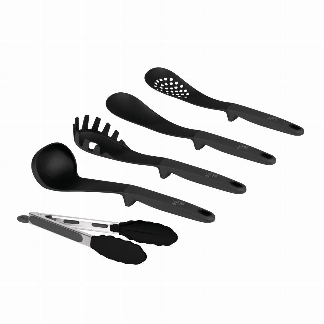 W zestawie: łyżka wazowa, do makaronu (z miarką porcji), cedzakowa, kuchenna oraz szczypce. Nylon jest bezpieczny dla powłok non-stick. Nowoczesny design ułatwia utrzymanie czystości w kuchni.