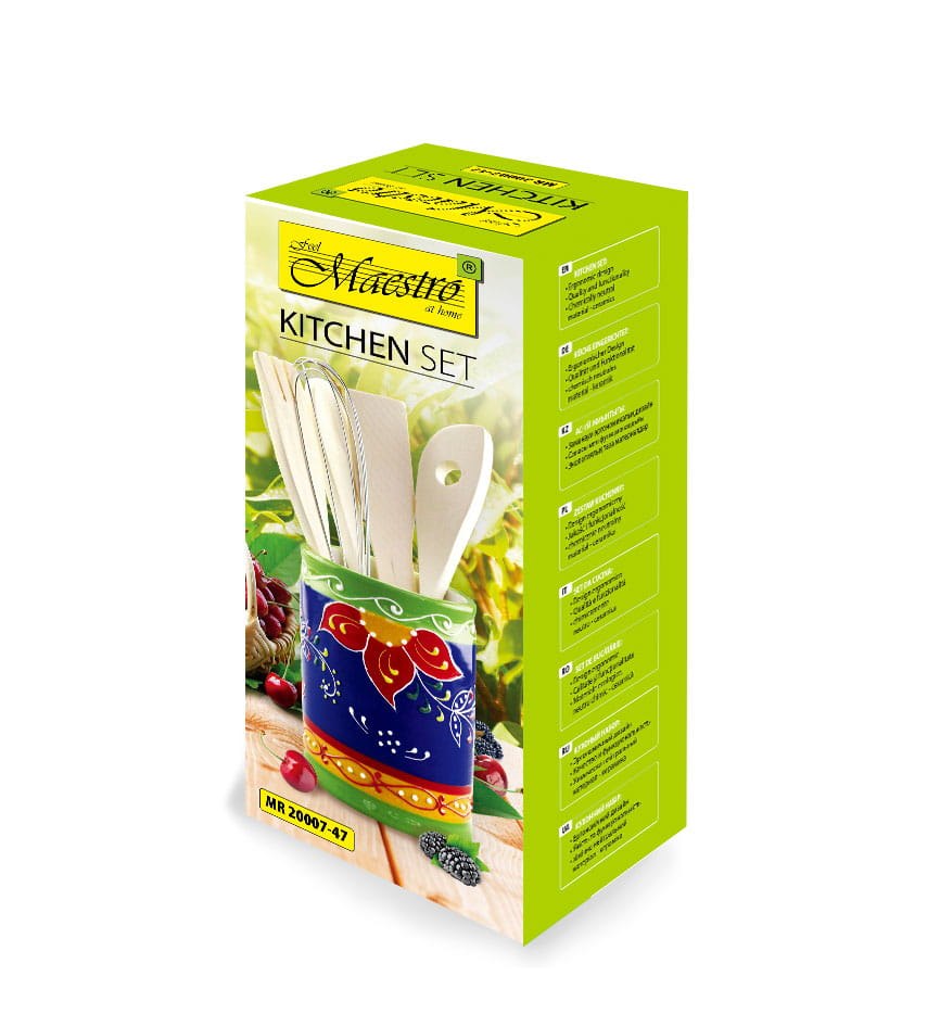 Rustykalny urok. Zestaw Maestro MR-20007-47 to 4 solidne, drewniane przybory kuchenne umieszczone w ozdobnym, ceramicznym pojemniku z motywem kwiatowym/roślinnym.