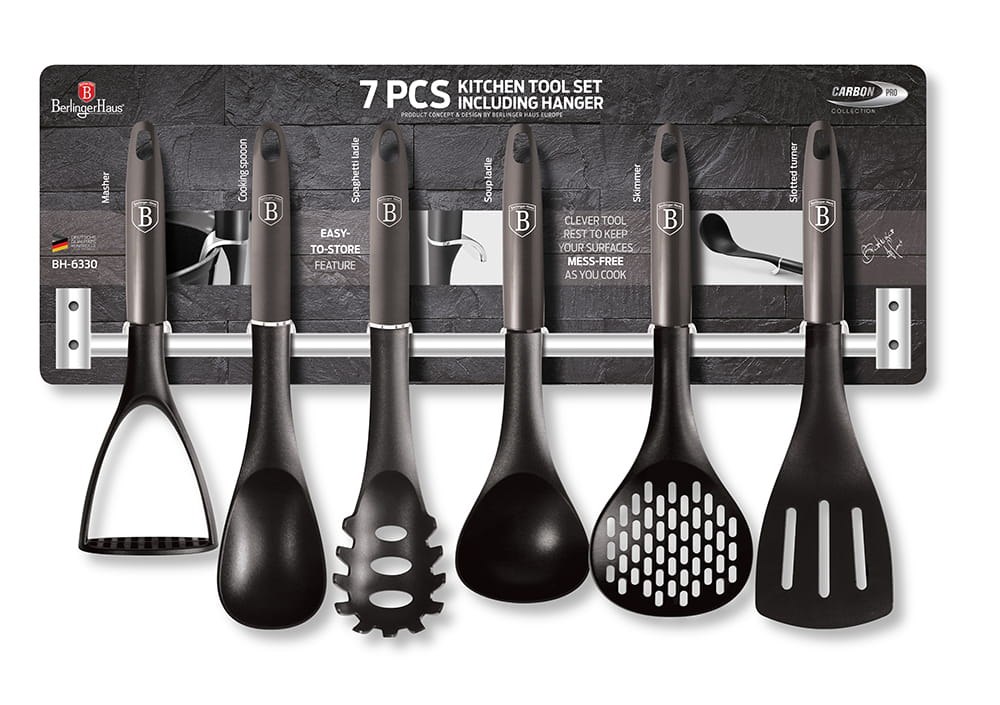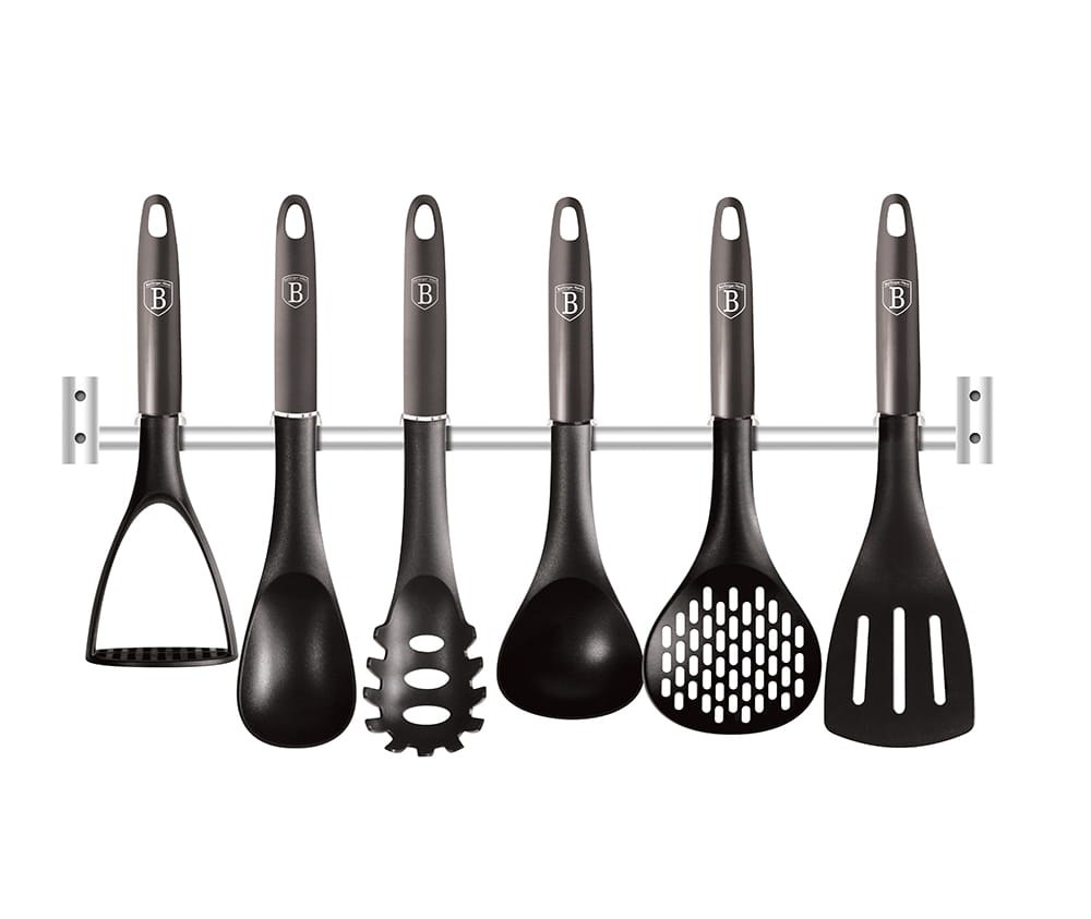 Grafitowy styl. Zestaw Carbon Pro BH-6330 to 6 nylonowych przyborów w nowoczesnym, szarym kolorze oraz reling ścienny. Idealne rozwiązanie do industrialnych kuchni.