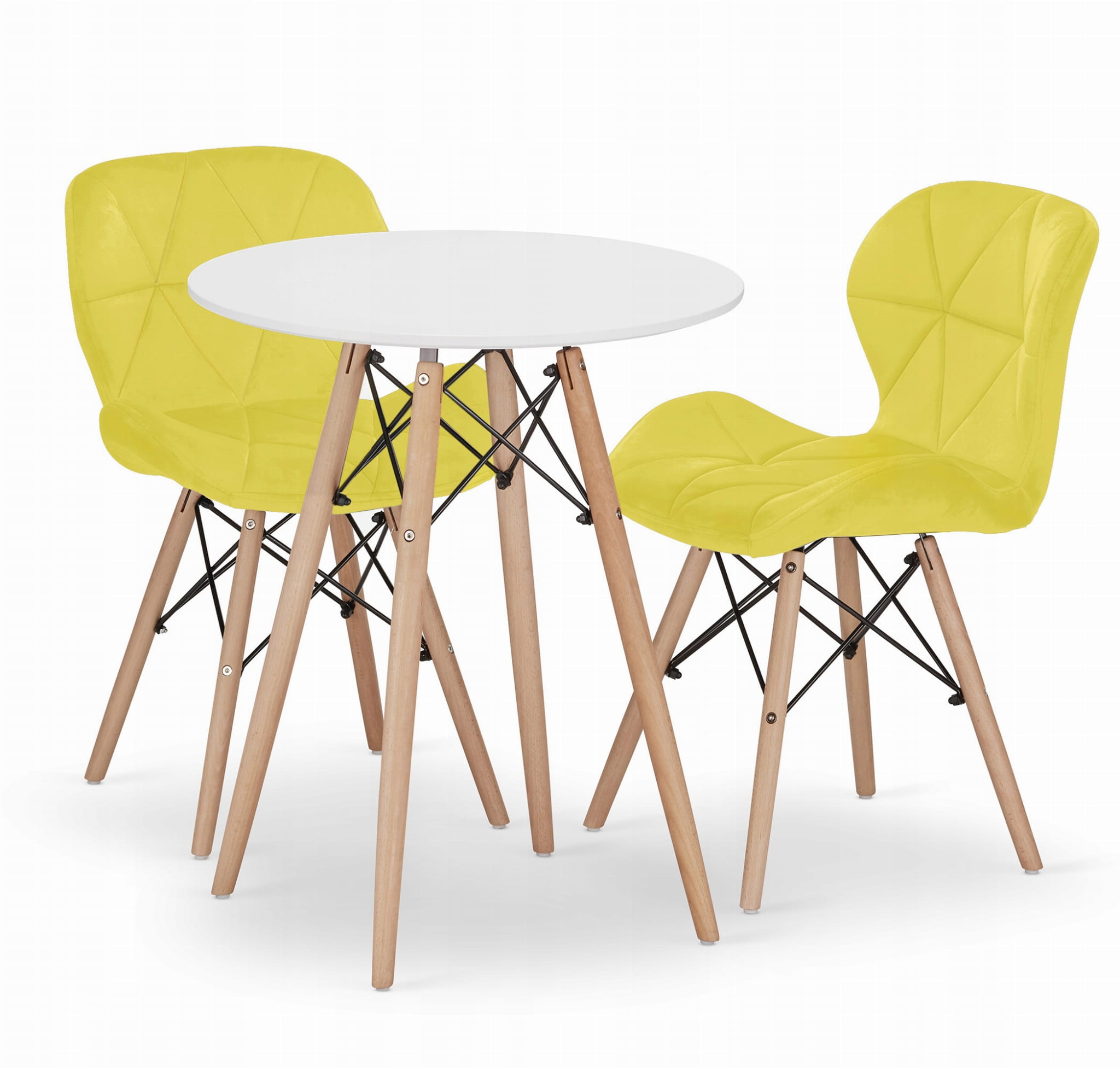 Rozpocznij każdy dzień z uśmiechem przy tym energetycznym zestawie. Biały, okrągły stolik TODI (60 cm) w połączeniu z dwoma żółtymi krzesłami LAGO ożywi każdą, nawet najmniejszą kuchnię. Żółty kolor tapicerki (welur lub ekoskóra – weryfikacja: opis podaje „ekoskóra” w tym modelu LAGO, w innych był welur/aksamit. Tu: „materiał siedziska – ekoskóra”) jest łatwy do przetarcia i niezwykle efektowny.