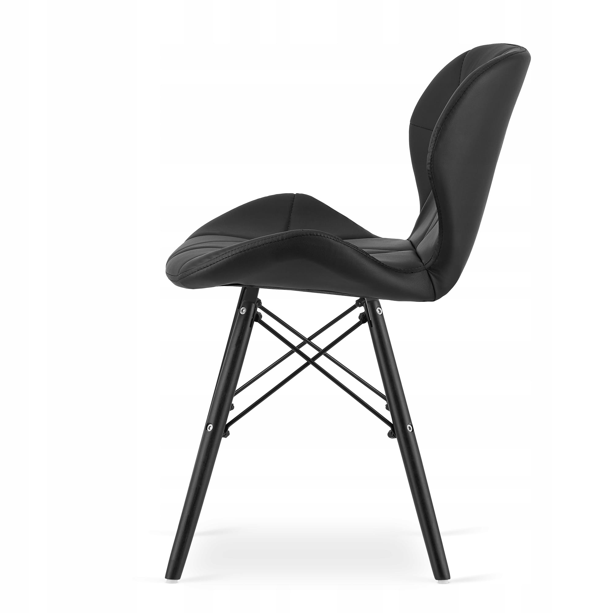 Krzesła LAGO na drewnianych nogach są stabilne i wygodne (miękka gąbka). Kontrast jasnego blatu z czernią siedzisk świetnie wpisuje się w trendy loftowe i nowoczesne.