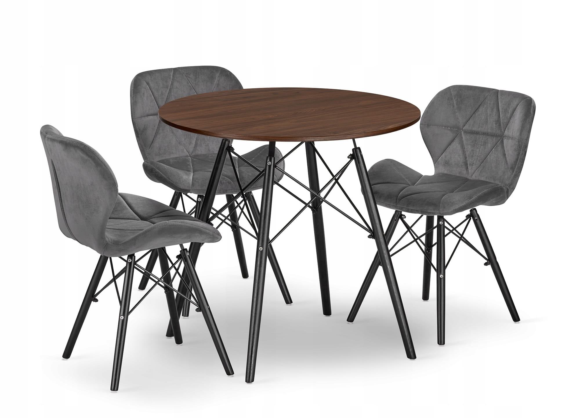 Zestaw jadalniany: okrągły stół 80 cm w kolorze jesionu i 3 szare krzesła welurowe. Naturalny wygląd i wygoda. Idealny dla 3 osób.